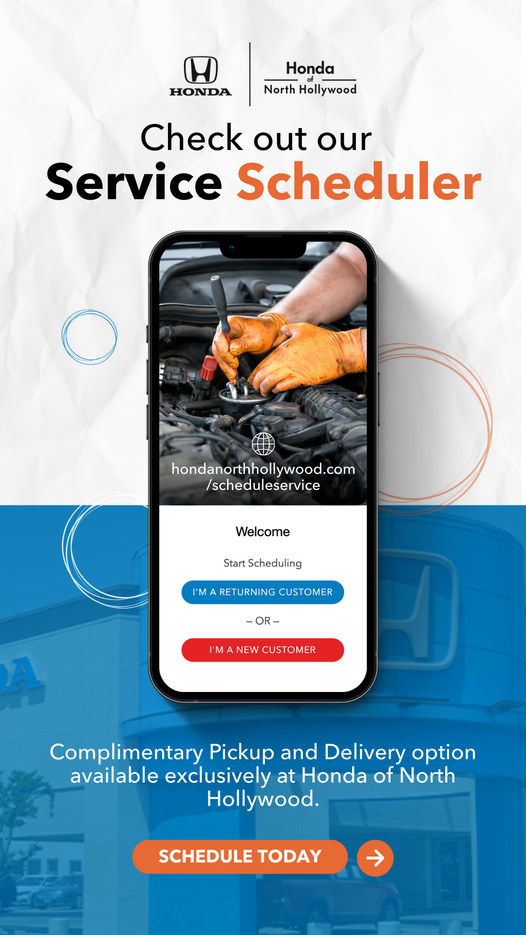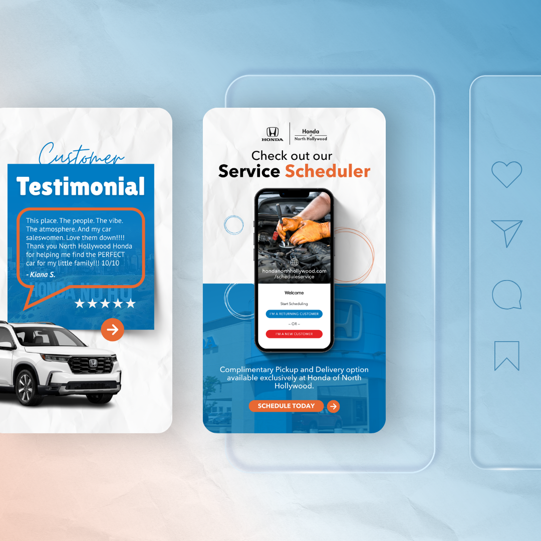 With each new automotive client, a member of the creative team at Dealers United creates 8-10 designs to either set up or boost the client's social media accounts. I created the onboarding assets for Honda of North Hollywood, designing for platforms such as Pinterest, Facebook, and Snapchat. Their brand aligned closely with Honda’s existing brand identity, so I built on that foundation with a theme that added elements to highlight their location and individuality.